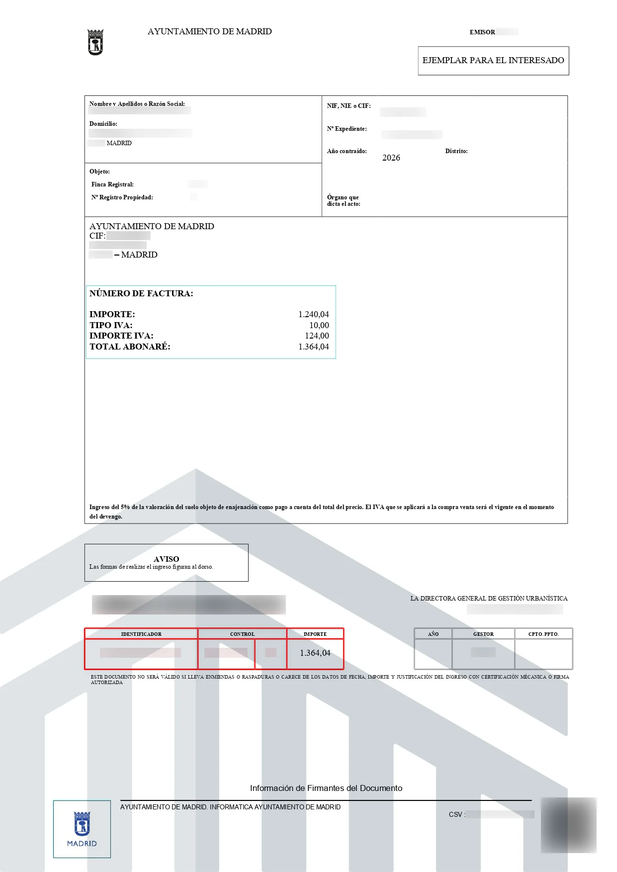 Tras cerrar todos los trámites previos a la firma, en el momento de la escrituración pública del derecho de propiedad del suelo, deberá satisfacerse el pago de la cantidad restante + IVA reflejada en el acuerdo de compraventa mediante cheque bancario nominativo a favor del Ayuntamiento de Madrid. En el mismo acto se entregará la factura de compra del suelo.